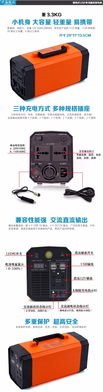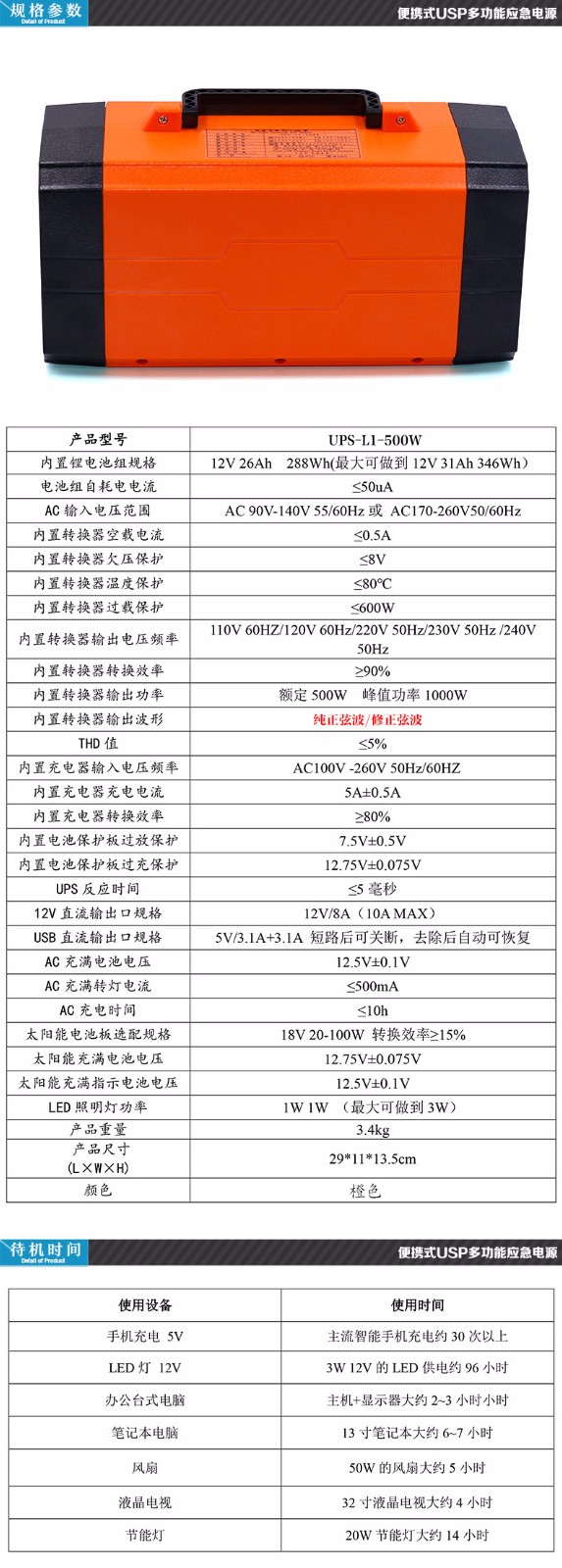 金品陽(yáng)光便攜式UPS移動(dòng)應(yīng)急電源,秒切換,不斷電,重量?jī)H3kg,500w功率。4個(gè)USB接口,4個(gè)12V直流輸出口,支持太陽(yáng)能充電,LED照明燈等實(shí)用功能。最主要的是輕盈便攜美觀安全又環(huán)保,價(jià)格實(shí)惠,是您居家旅行,辦公作業(yè)必備良品!適用于各種移動(dòng)設(shè)備,手機(jī),平板,筆記本電腦,攝影器材,電動(dòng)平衡獨(dú)輪車,雙輪車充電,醫(yī)療器械等.